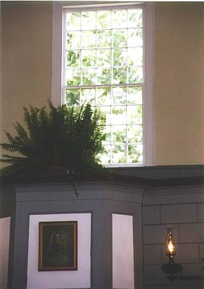 At some point in its history, the church received a suspended tin ceiling, similar to one at Tranquility Grange (also on the National Register). The original woodwork and boxed pews have been retained much as they were in 1821. The window panes are 12-over-12, except for the 20-over-20 center window over the front door. A great many of the panes are original, wavy glass. The original front stone steps - not ADA-accessible - have recently been restored.